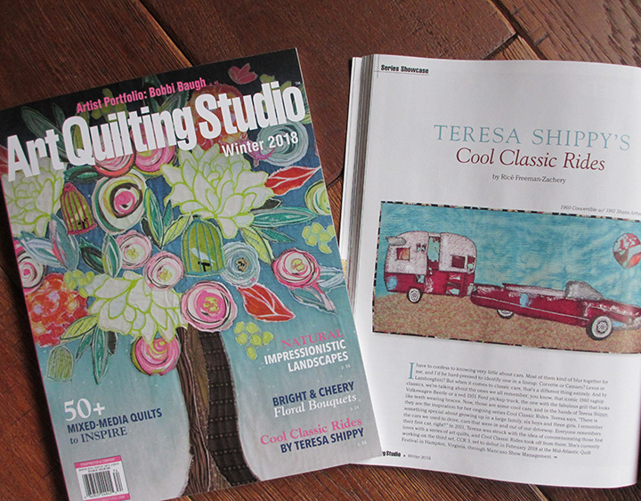 A whole lot of love going on in-between my “Cool Classic Rides.” Hope you have a chance to catch my article in Quilting Arts Magazine April/May issue “Creating Fabric Designs from Tin Tiles” also available via download/dvd. Be sure to check you’re local PBS listings. In my area, series 1900, episode 12 titled “Color It Beautiful” airs this Sunday April 9th, 2017. Additional info, quiltingartstv.com