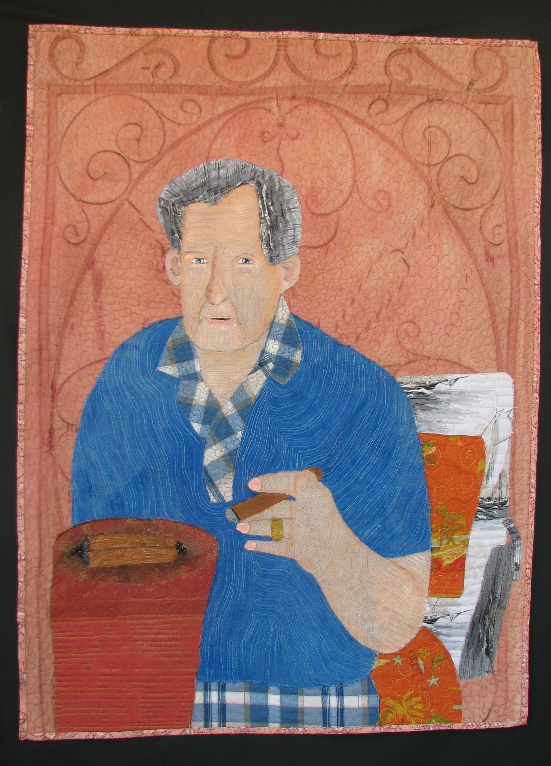 After coming back from a baseball game Friday night I was elated to find an acceptance email from SAQA Layers of Memory. “knowing Roy” will be in travel mode for quite some time. Penny and I are thrilled to have this piece travel. This piece is for my sister Pen, who is amazing with her Roy, she works around the clock tending to his needs as well as making sure he is comfortable. He is in his final stage of Dementia with Lewy Bodies.  I had taken several pics of him sitting in his chair on the patio where they live. I was able to catch that slight sparkle in his eyes that once was so bright. A tough piece for me to do, but when I got myself in the moment, it all flowed together. Let me know your thoughts?