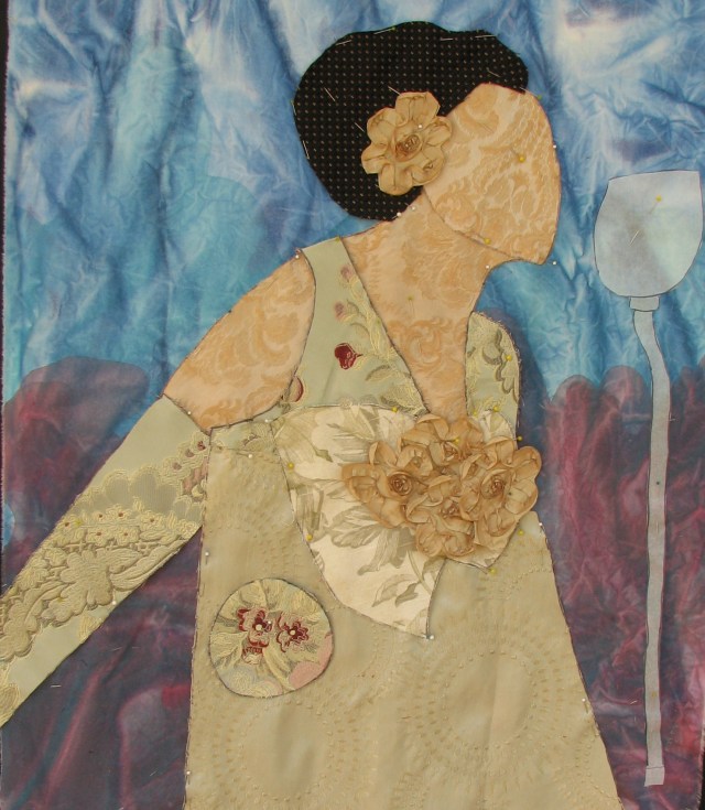 Gotta love music. “Jazz Singer.” A fresh piece in the works. Thought I would post the early stage of this piece. Always start with a freshly or slightly older painted background fabric.(I painted this sometime ago.) Cut out paper templates of each section of the design.  The skin tones are wonderful vintage fabrics.