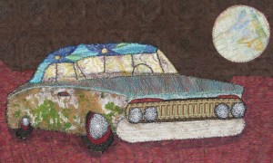 I usually stand back to get a good look of where I want to start to section off.  You can see that the sections have been numbered; these will now be my pattern pieces. All of the rides that I have designed have approximately 20 or more pattern pieces. I really love to use vintage fabric remnants. Sometimes I’ll also use pieces that I have painted on cotton canvas fabric. As usual, heavily stitched using Valdani cotton threads.
