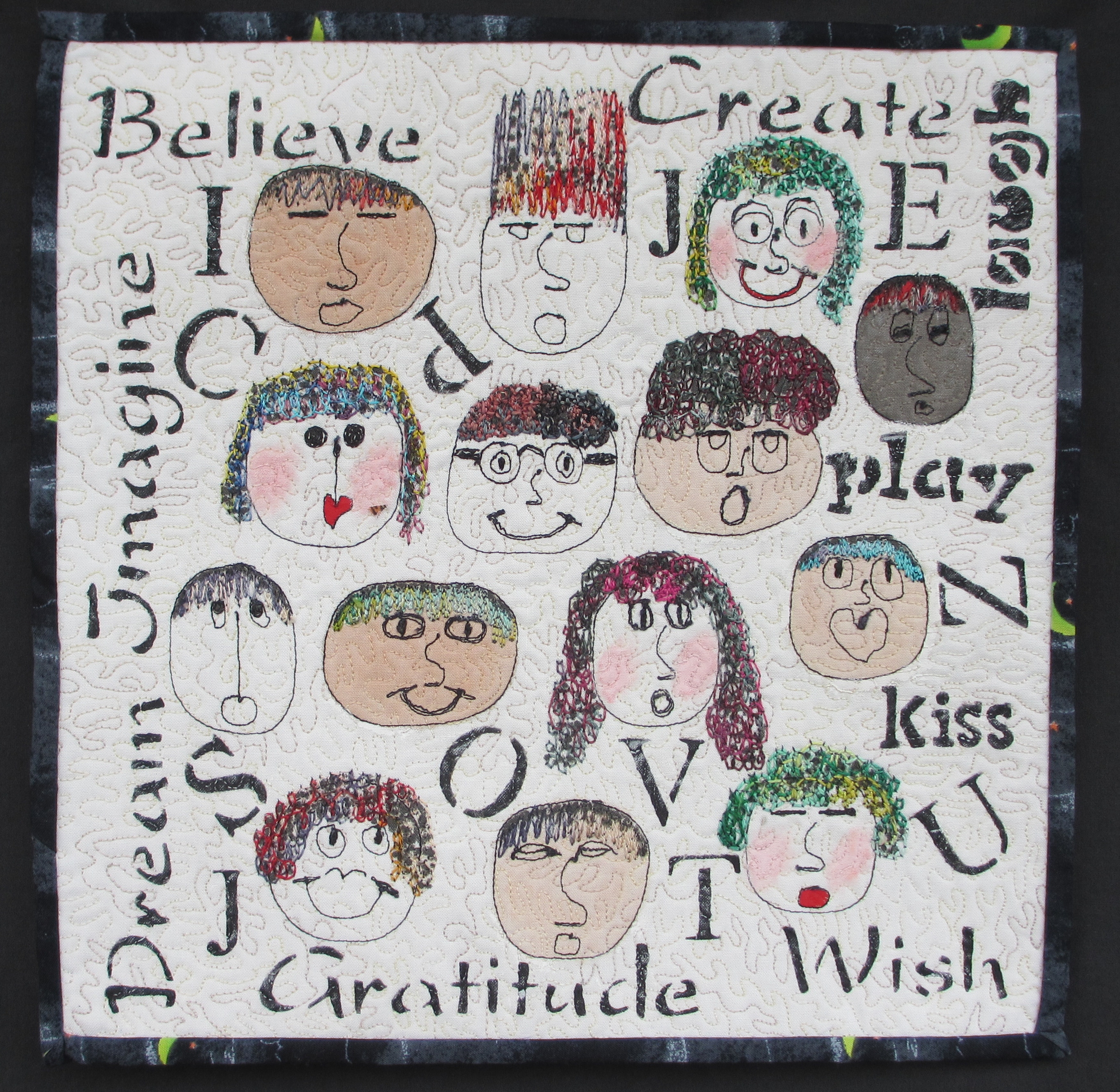 Love to do faces! Happy to be part of a wonderful art group. The Serendipities current rotation trade theme is “face Value” My 12 x 12 , “Harmony” is free-motion thread stitched using Valdani Hand Dyed Variegated Threads. The background was stitched with a beautiful hue, Subtle Elegance,  50 wt. I used Black Night, also 50 wt. to outline the faces, and also fill in the facial features. Pearl Cotton #8 and # 12 was used from the reverse, bobbin work for the hair. The pearl cotton threads really added a nice textured look. Different weights of these threads create a variety of textures; because I tend to embellish heavily with threads its so important to me to have the quality. Valdani provides just that, a fantastic product!Harmony 2013