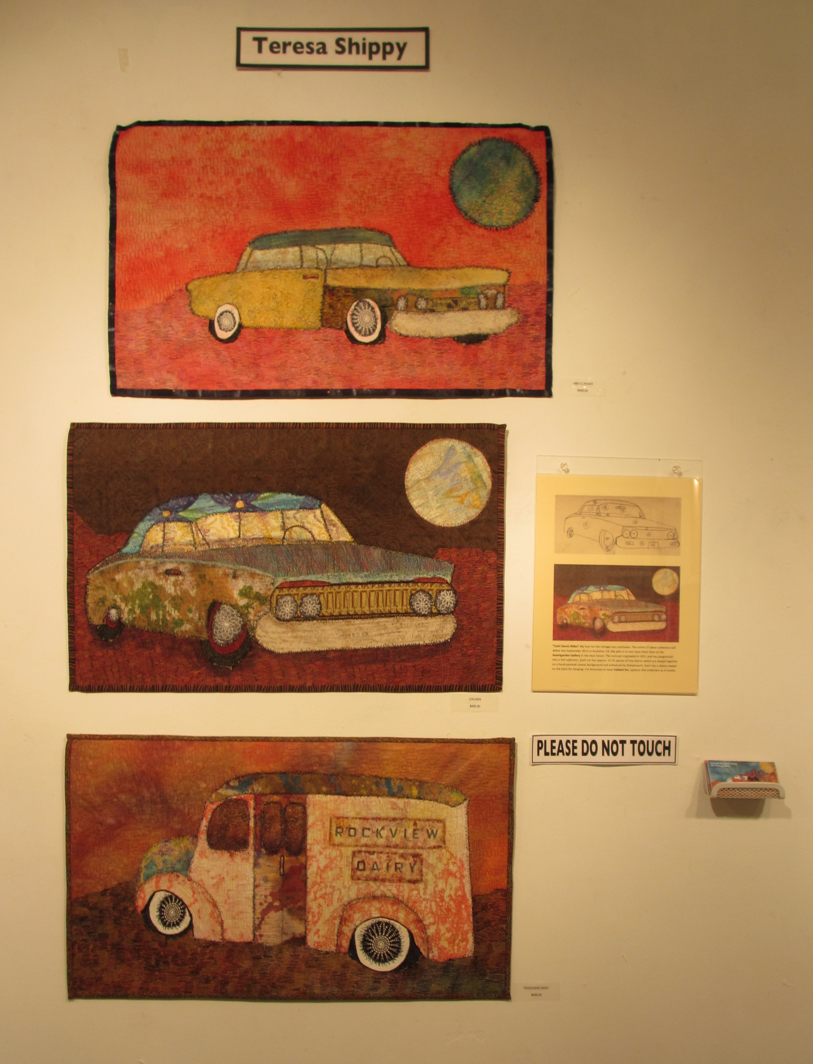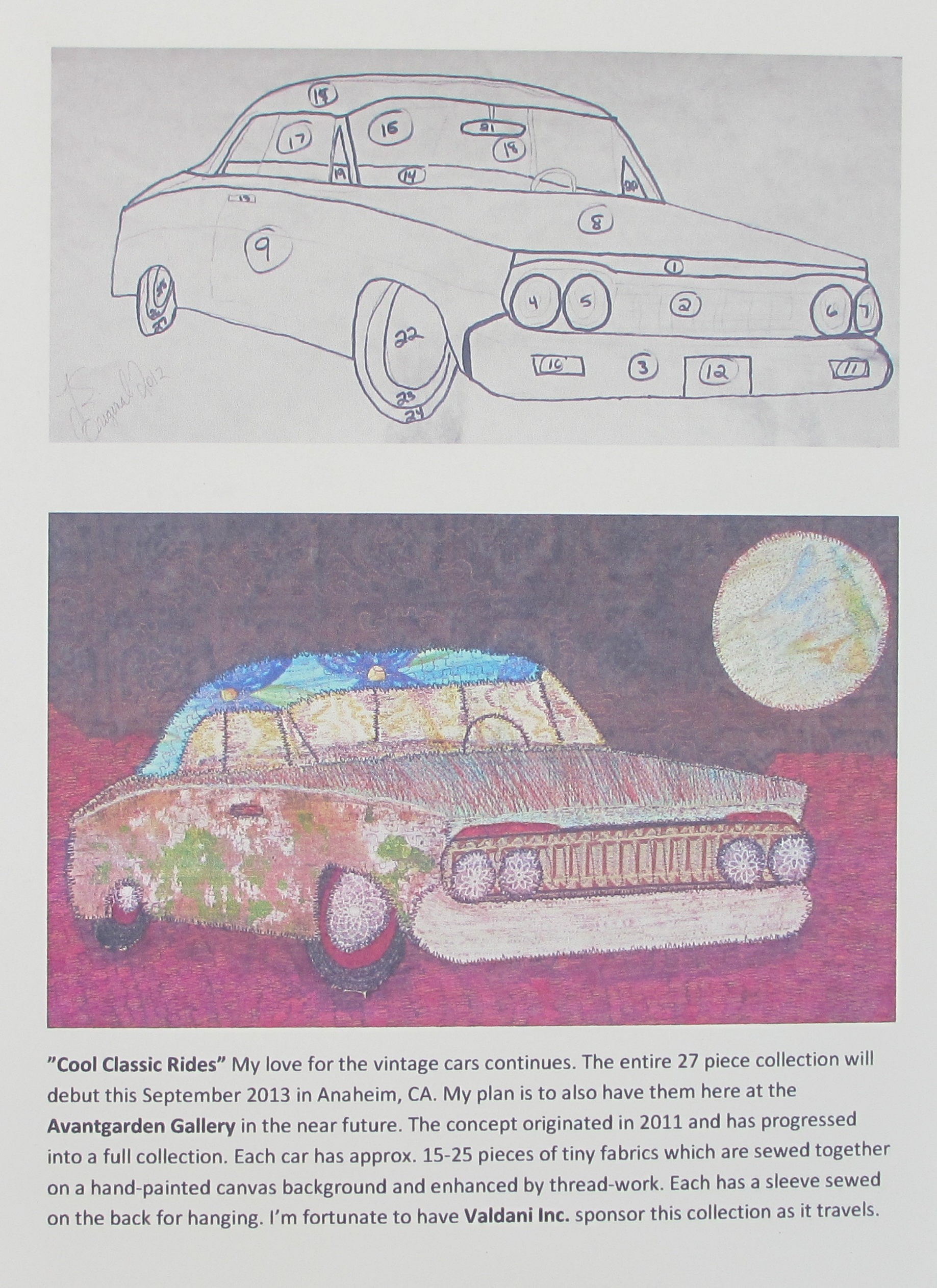So many memories!  Love the classic car shows. Mom used to drive a pale green corvair way back in the day. Three of my fiber art cars are currently on display @ the Avantgarden Gallery  in downtown Santa Ana, Ca. The entire 27 piece collection will debut this September in Anaheim, Ca. Additional dates for 2014 coming soon.I’m forever grateful for Valdani  Inc. for their wonderful support and sponsorship. Each car is approx. 15-25 pieces of different fabrics stitched onto a hand painted canvas cloth. All 27 cars are stitched with Valdani  Hand  Dyed Variegated Threads. The original concept started in 2011; I thought it would be cool to design funky cars out of pieces of leftover fabrics, some from cut/up quilts, left over painted pieces from my workshop classes, anything that looked on the vintage side was fair game for me to use.  Another source of an inspiration for me is remembering the cars that we had in our large family; 6 brothers, 2 sisters makes for many crazy fun cars to create!  Enjoy the ride…….