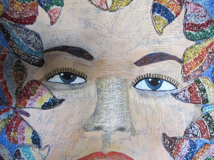 I love the look of threads mixed with a painted texture. The theme is My Inner Self Portrait. Below is a partial detail shot. All the works of art in this special exhibit measure 30 x 50. My piece was based on a photo of my Mother who was about 20 at the time. She looks as though her heart is heavy with a glow of sadness in her eyes. I love the photo even though she looks lost in her thoughts. Thrilled to have “Through My Mother’s Eyes” debut alongside fantastic works by fabulous artists at Road To California, January 22-25, 2015. Check out amazing art at Beyond the Edge Fiber Artists. Link below.