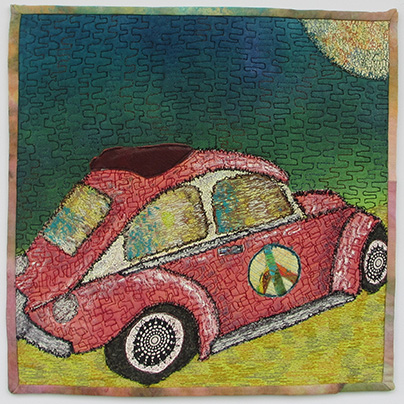 Here is my Lil’ 12×12 included in the auction “Cool Daze Ahead” Thrilled that this sweet ride is part of a special section accompanying the International Quilt Festival in Houston. Be sure to stop by the SAQA booth. A much larger “Bug” will debut alongside 23 very “Cool Classic Rides” at the Mid Atlantic Quilt Festival February 25-28, 2016. I’ll be there-Hope to see you too! Stay tuned….