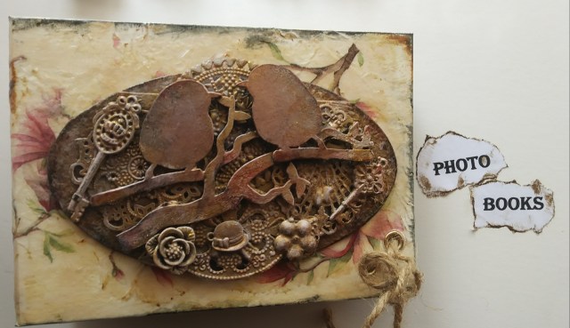 Art: In between my stitching and tin tile paintings. I absolutely love working on vintage books and the like. I find it very therapeutic repurposing old books into original one of a kind designs… Here is the cover of one of my repurposed books. Enjoy!