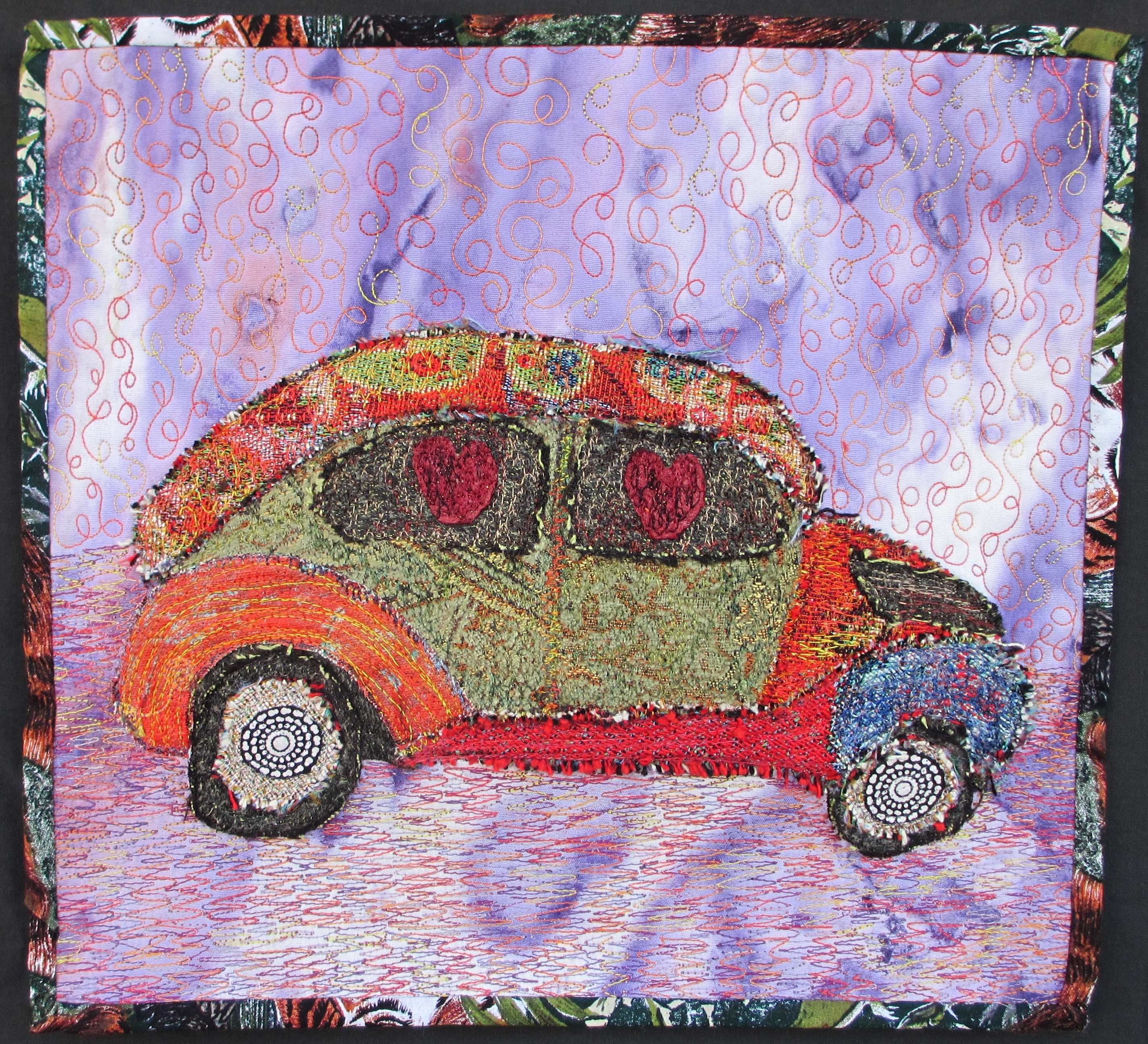 My latest car design. This Lil’ cutie will be auctioned off to benefit a wonderful organization SAQA, info here http://saqa.com (News/Events) I really am enjoying the car series. My goal was to make 10, I can see myself making many more. This one has approx. 20 little pattern pieces that I made after sketching the car from a funky old photo. As most of you know, I like lot’s of color, and as usual its heavily stitched….
